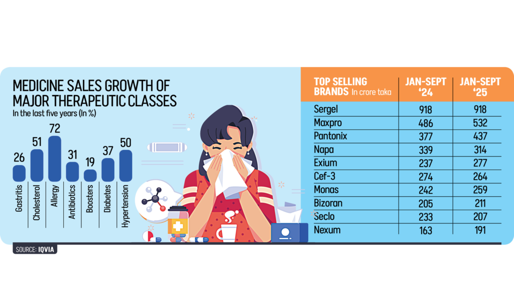 👉 Allergy medicines alone generated around Tk 1,200 crore in revenue in the first nine months of 2025, showing strong and sustained demand.